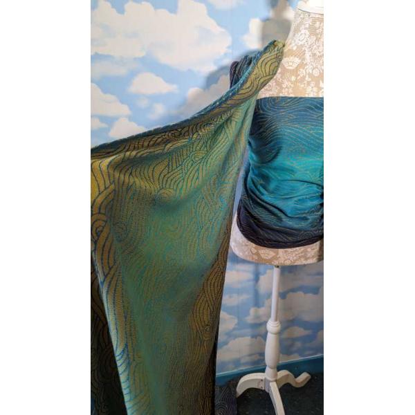 This gorgeous 100% organic cotton fabric is woven on a stunning deep sea tones gradation, from deepest blues through turquoise shades to rich teals. The rolling waves of the Rei design are picked out in an opulent golden yarn. Our organic cotton is softer and stronger than most cottons, produced ethically this cotton is grown with care and without chemicals keeping the land, and farmers, healthy.