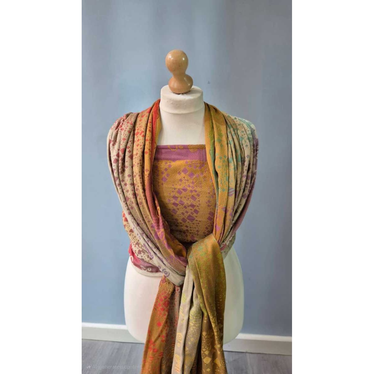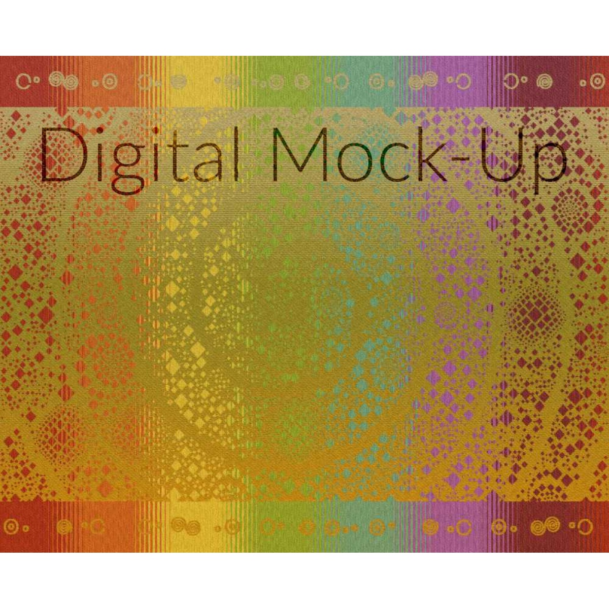 Serpent Sunrise Labyrinth: This weft is a fine organic combed cotton in a 7-colour graduated blend, woven using our alchemy weave. We’ve come up with a unique idea to add something special to this cloth and made the rainbow colour repeat slightly longer than the pattern repeat. This means that the colour slowly shifts across the design, allowing different colours to highlight key areas of the pattern, rather than always having the green in the centre of the ‘swirl’. The wraps are 100% organic combed cotton and approximately 235gsm. This is a great wrap for beginners to learn on, and for the old hands to use with some beautiful, fancy finishes!
